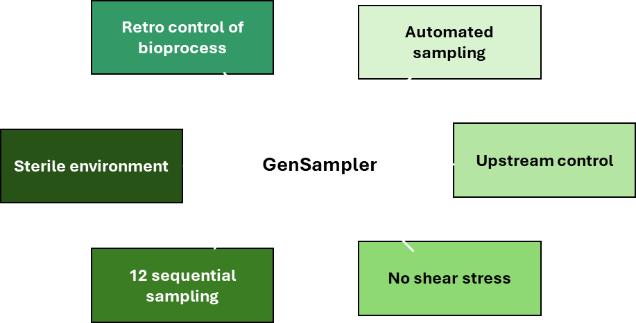 GenSampler, is an automated system that enables a sequential sampling of drug-producing cells directly from the bioreactor without shear stress. Cells are then mixed with lysis buffer, which allows to extract and analyze the RNA in a separate experiment to identify the biomarkers of interest.